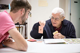 Ray Hyer, right, assists Tyler Perdew with his vowel sounds at their Thursday tutoring session. Hyer said they have made progress over the duo's 83 meetings.